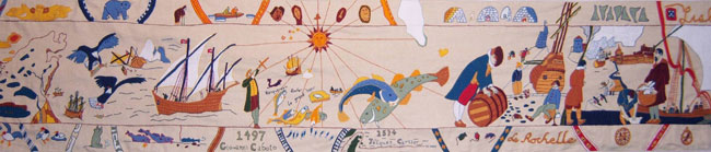 began in 2006 and was completed in November 2009. The tapestry depicts the history of the French Shore of Newfoundland and some of its historical connections through the means of embroidery. The tapestry is loosely based on the famous Bayeux Tapestry which was stitched in 1087 and which tells the story of the Battle of Hastings, the Norman conquest of England in 1066. The artwork (sketches and color pictures) were done by Christina and Jean Claude Roy. All of the embroidery was done by a number of ladies from the community of Conche. The project was managed by Joan Simmonds. Financial support was provided by Service Canada, Dept of Industry, Trade and Rural Development and the Arts Council of Newfoundland and Labrador. This amazing piece of work can be view at the French Shore Interpretation Centre in Conche, NL.